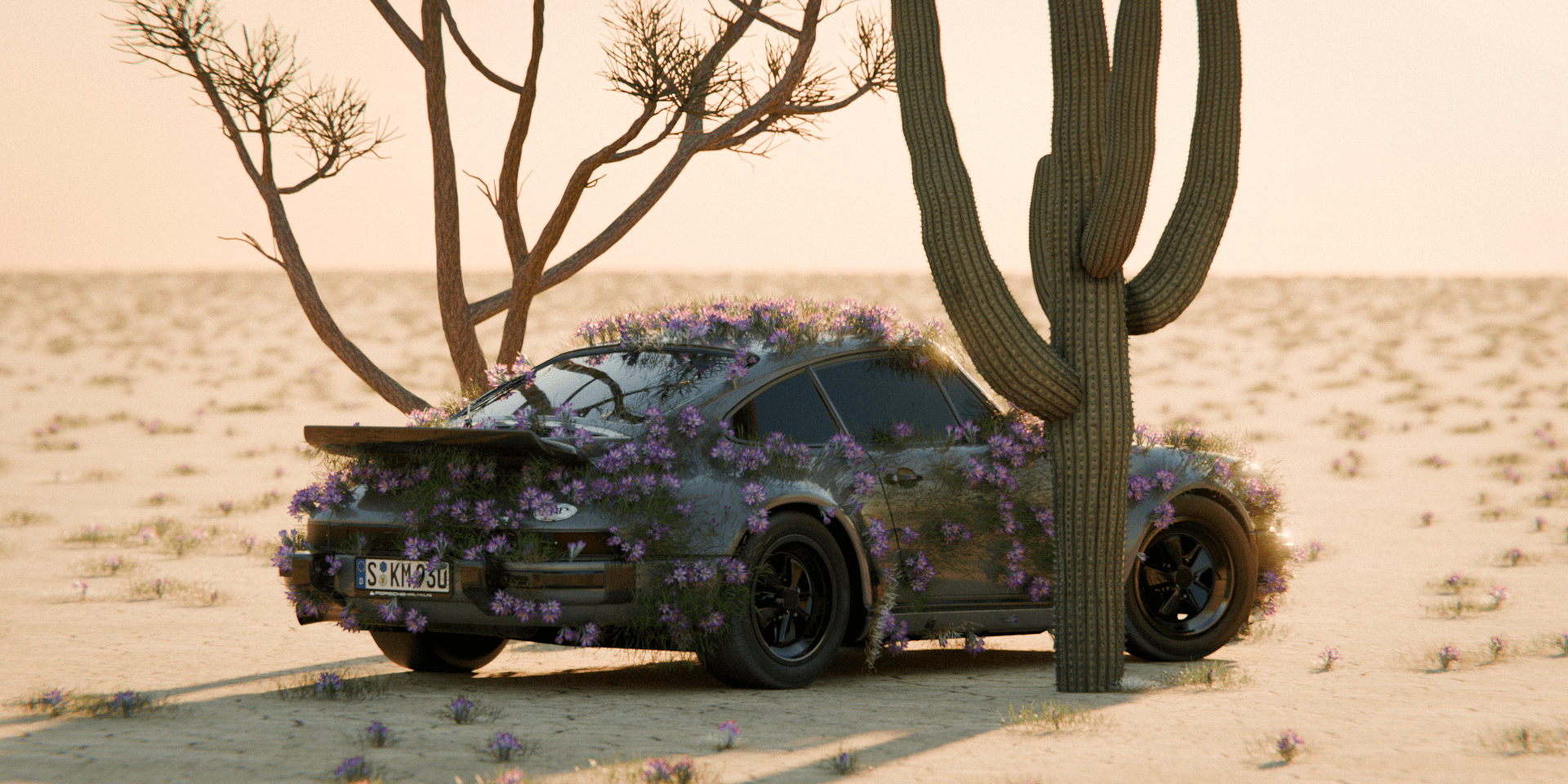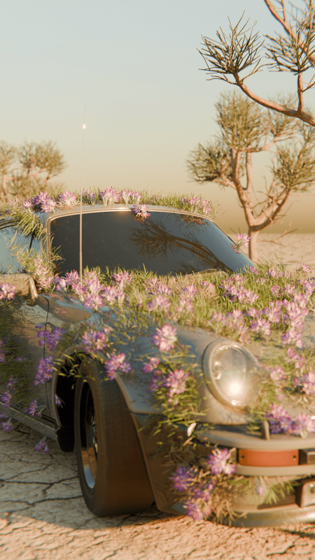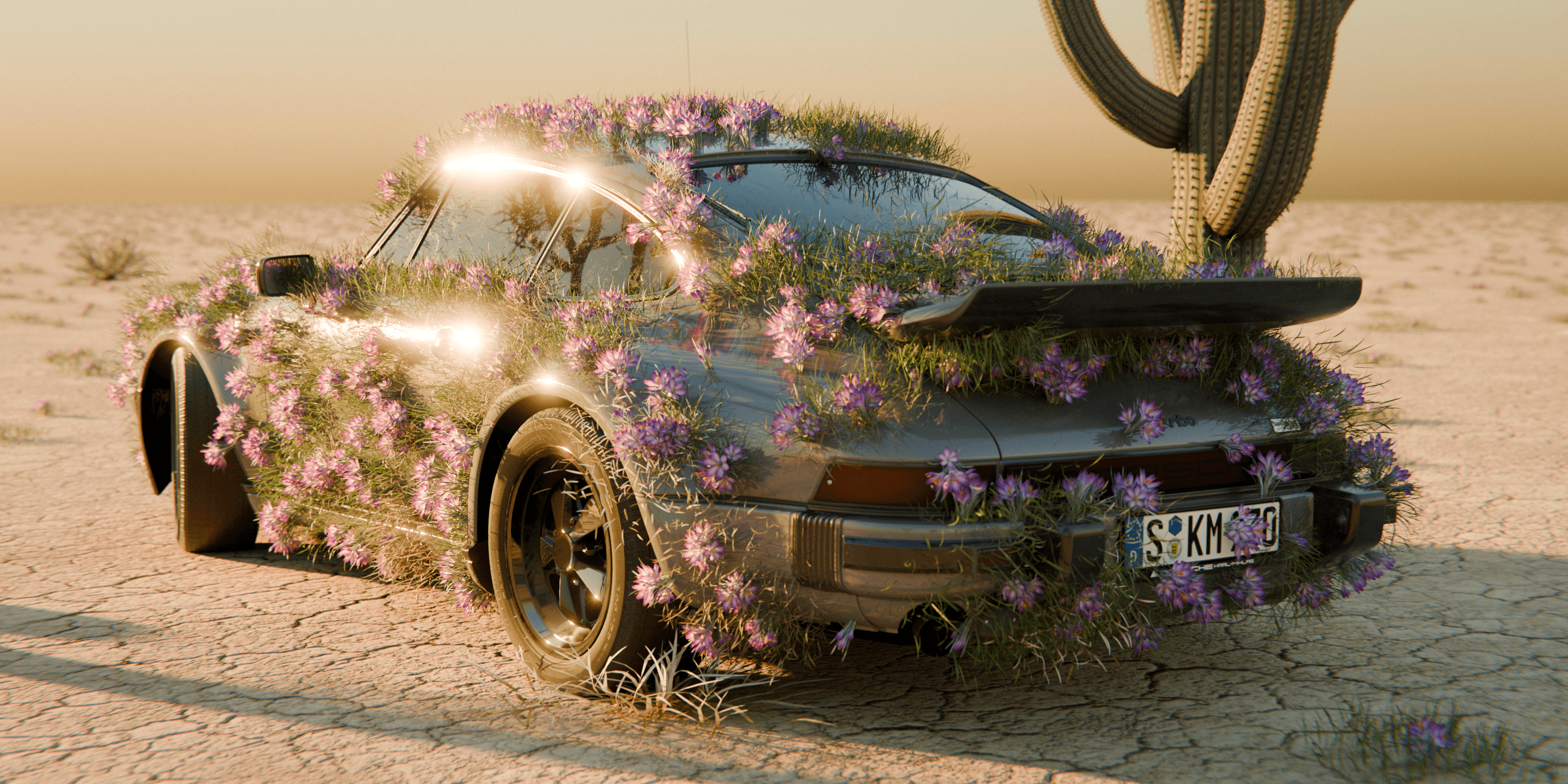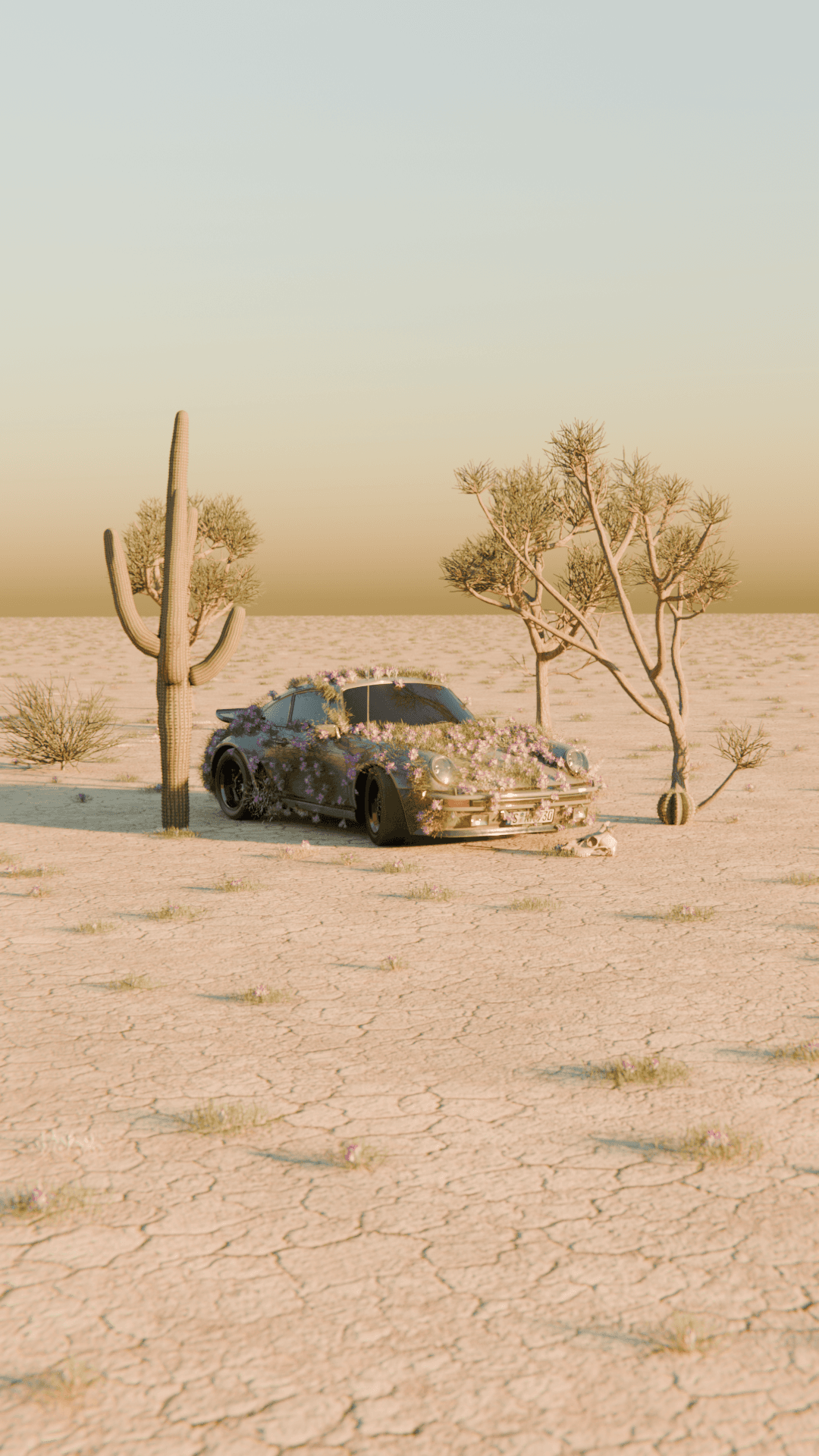 A 3D animation featuring a Porsche set in an endless desert, where the visual composition blends the abstract with the precise. The car, seemingly at rest, becomes the focal point of a surreal scene: delicate flowers slowly begin to grow from its bodywork, creating a harmonious contrast between engineering and nature. The atmosphere breathes calm— the silence of the desert and the organic growth generate a contemplative, almost dreamlike mood. The piece aims to convey serenity, transformation, and beauty at the intersection of the mechanical and the living.