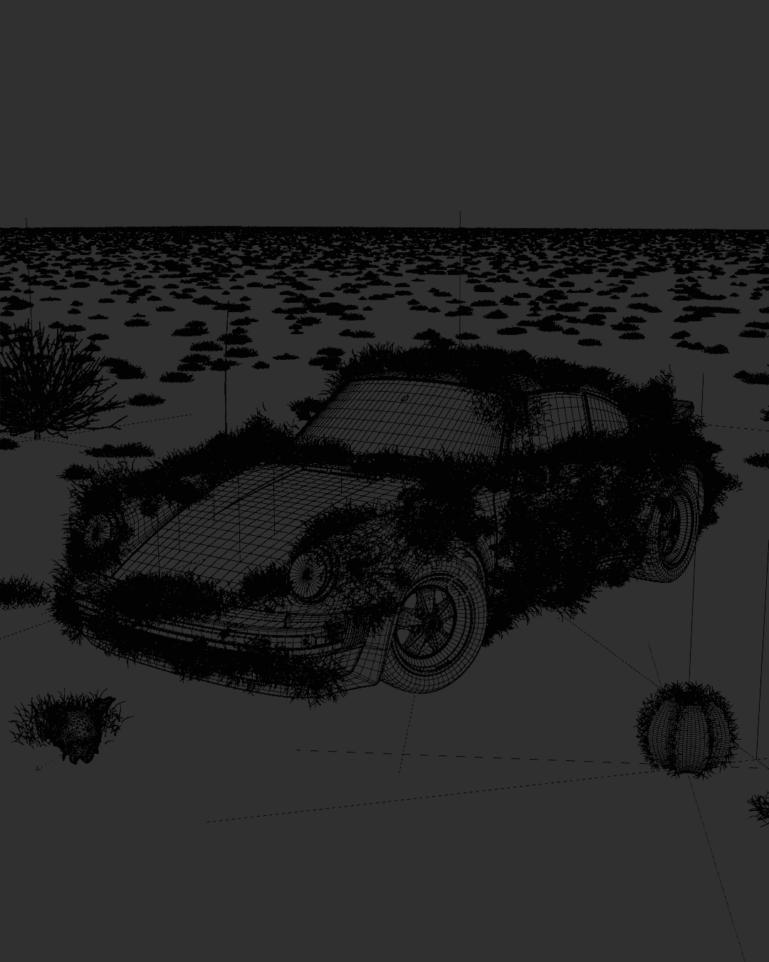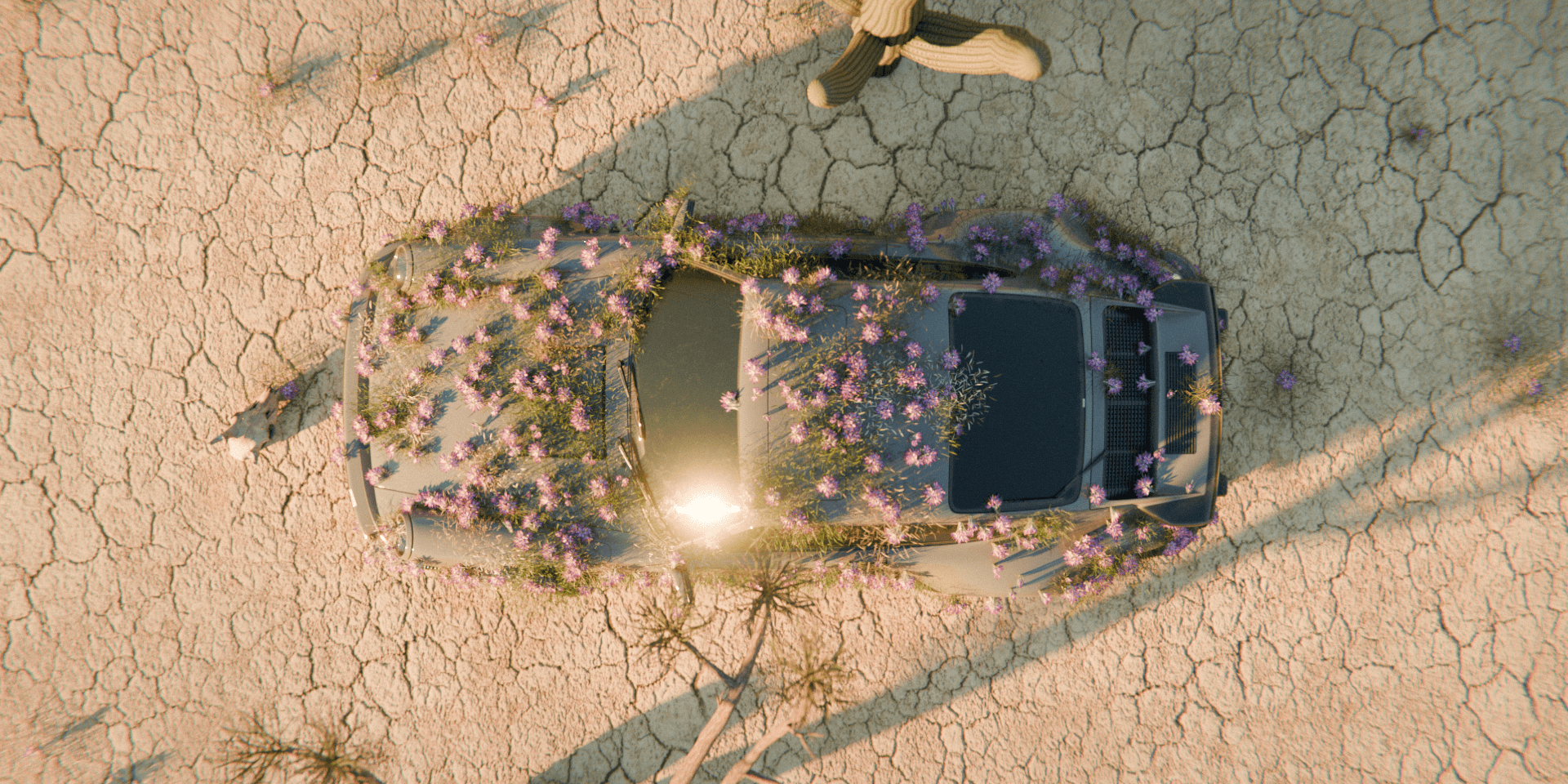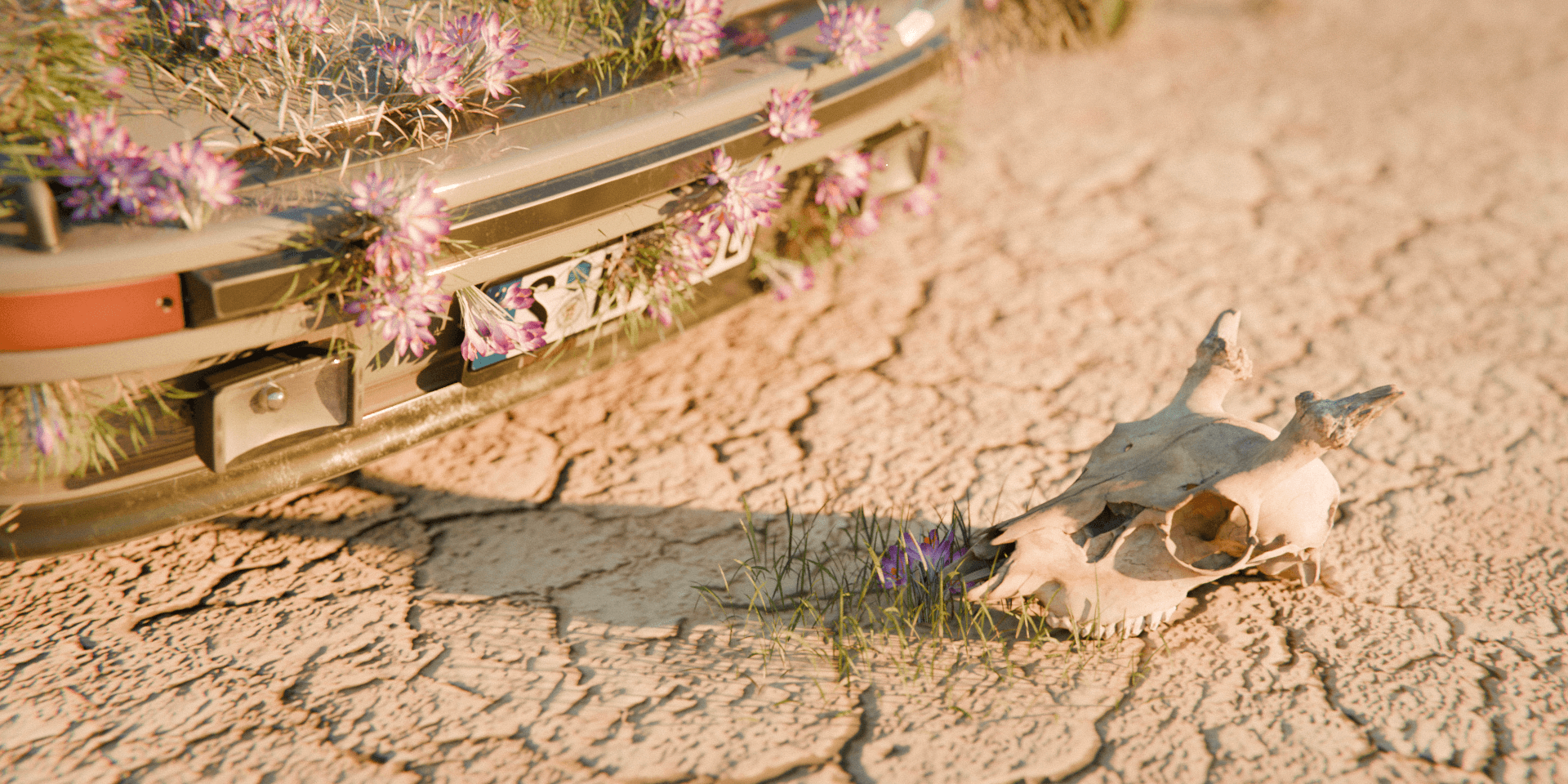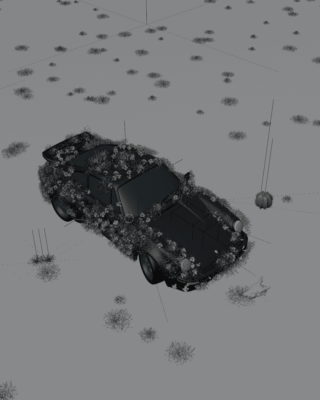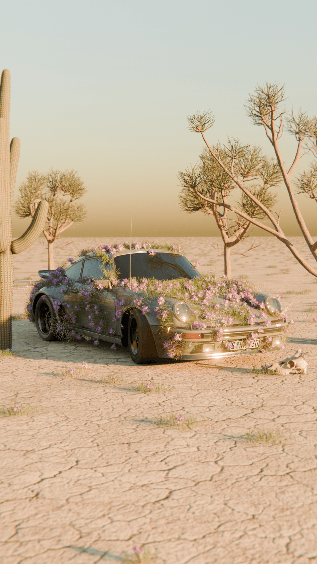 A 3D animation featuring a Porsche set in an endless desert, where the visual composition blends the abstract with the precise. The car, seemingly at rest, becomes the focal point of a surreal scene: delicate flowers slowly begin to grow from its bodywork, creating a harmonious contrast between engineering and nature. The atmosphere breathes calm— the silence of the desert and the organic growth generate a contemplative, almost dreamlike mood. The piece aims to convey serenity, transformation, and beauty at the intersection of the mechanical and the living.